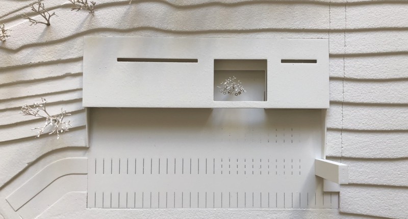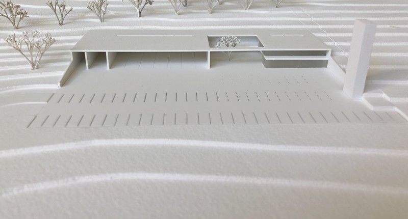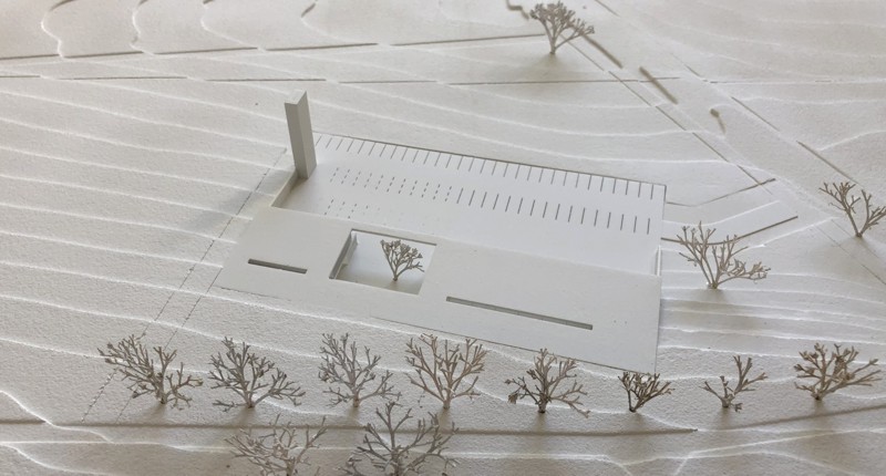 Ergänzend zur horizontalen Erscheinung schlagen die Verfasser einen in der Landschaft frei stehenden vertikalen Turm vor. Er markiert selbstverständlich im Landschaftsraum den nord-westlichen Abschluss des Geländes.