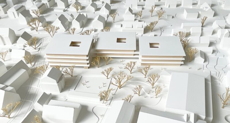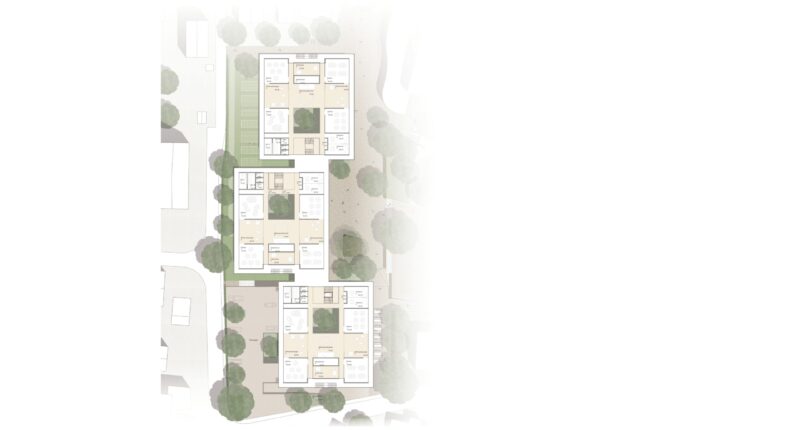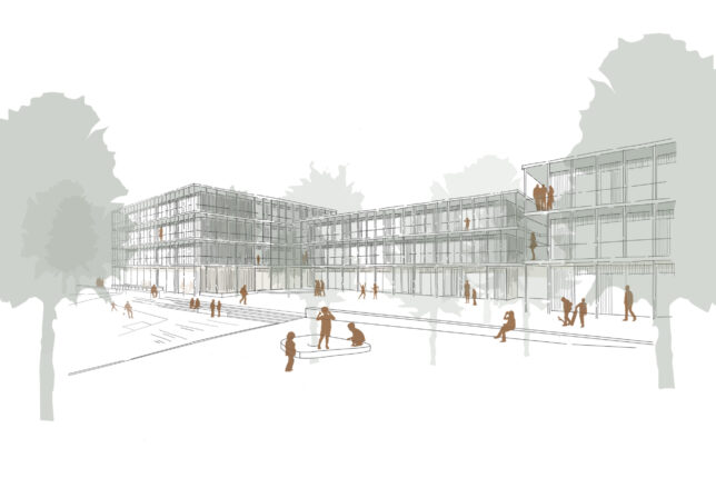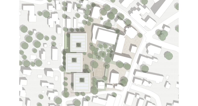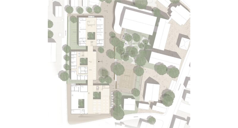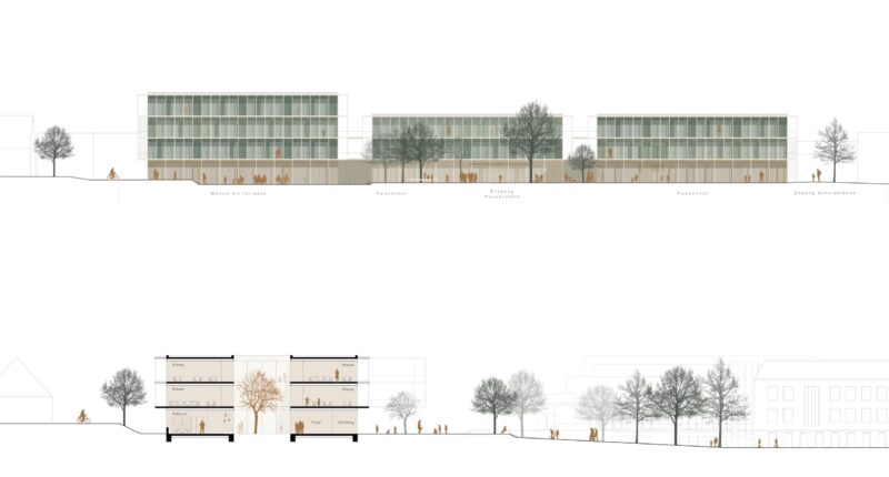 Die Verfasser ordnen das Raumprogramm in drei gleich große Baukörper, die sich entlang der Straße auf der Höhe von Norden nach Süden entwickeln. Die Baukörper sind zueinander leicht versetzt, so dass eine räumliche Mitte mit Baufeld entsteht. Die Baukörper sind baulich miteinander verbunden und wirken in Körnigkeit und Maßstab der Situation angemessen. Die Baukörper fassen die Straßenräume gut und schirmen zugleich das Schulgelände zur Straße hin ab, es bildet sich ein geschützter Außenraum.