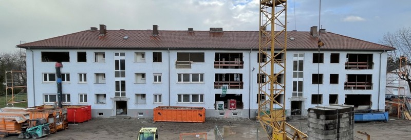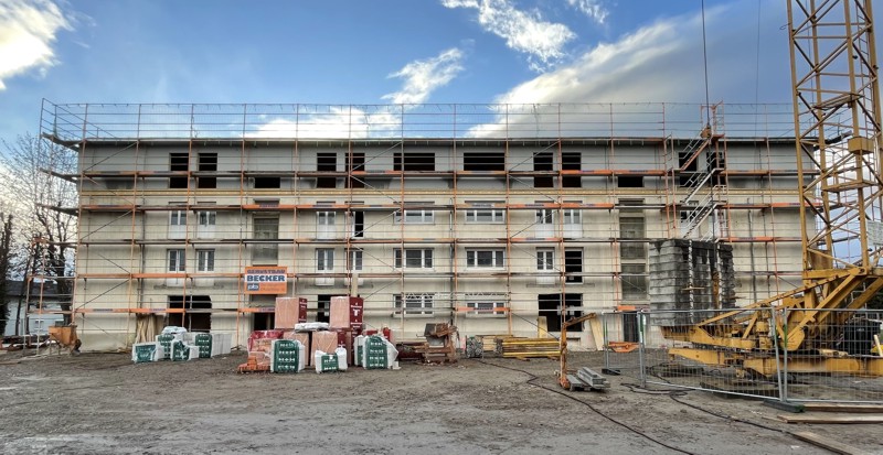 Die Bauarbeiten sind voll im Gange. Der Unterschied zwischen bestehendem 3-stöckigem und bereits aufgestockten 4-stöckigen Gebäude ist schön sichtbar.