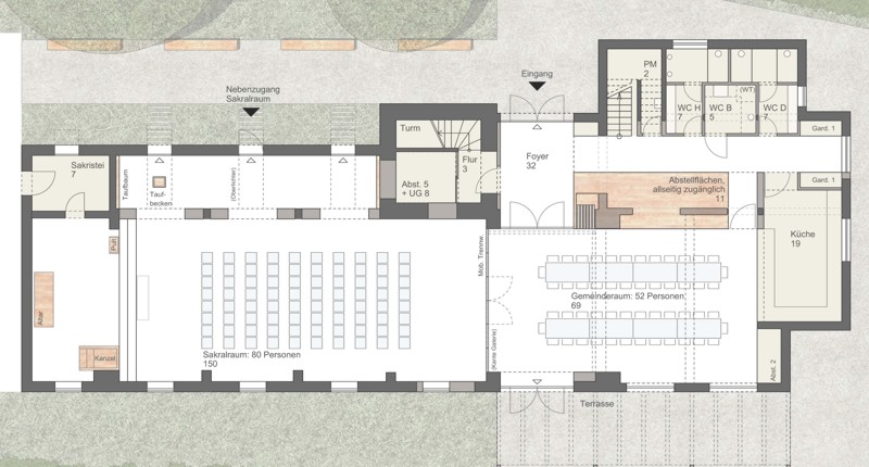 Durch die an zwei Stellen positionierbare mobile Trennwand ermöglicht der Entwurfgeschickt die Realisierung unterschiedlicher Nutzungsszenarien. Insbesondere die Möblierungsvarianten „Festgottesdienst“ und „Hochzeit mit Bewirtung“ wird mit ihrer klaren Erschließung und dem zentralen Einzug in die Kirche positiv bewertet.