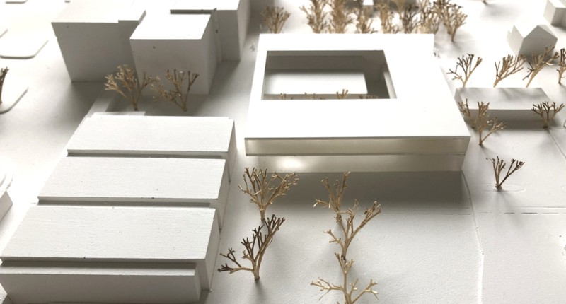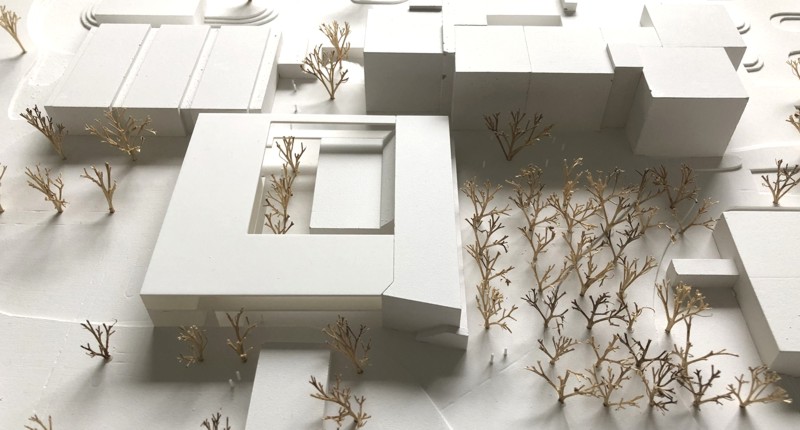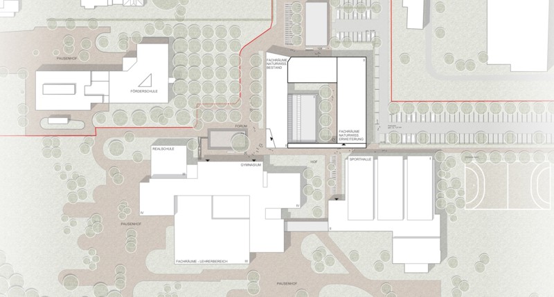 Die Verfasser entscheiden sich, die Naturwissenschaften am bisherigen Standort zu konzentrieren und den jetzigen, etwas sperrigen Baukörper der Naturwissenschaften zu einem gestalterisch vollwertigen Baustein des Schulzentrums zu ergänzen.