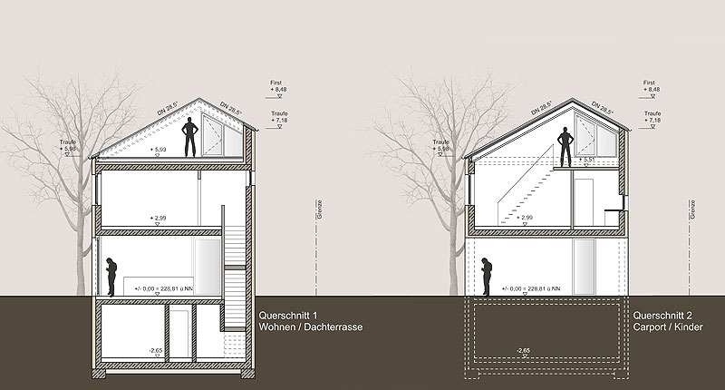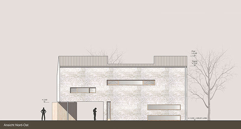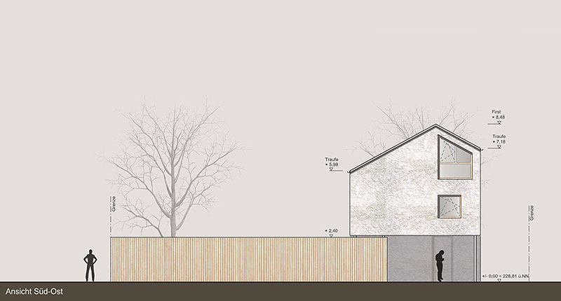 Die Entwurfsaufgabe besteht darin, in dem heterogenen Umfeld eines Neubaugebietes ein Gebäude zu schaffen, das in zurückhaltender und zeitloser Architektursprache die Gegebenheiten des Ortes möglichst gut nutzt und zum individuellen und wertigen Zuhause für eine 4-köpfige Familie wird.