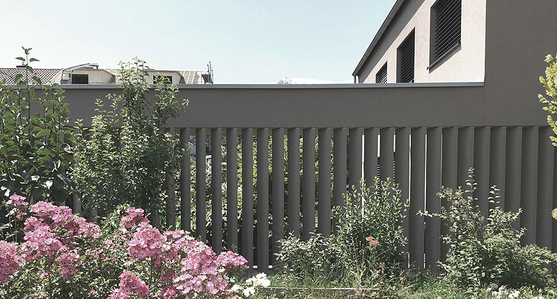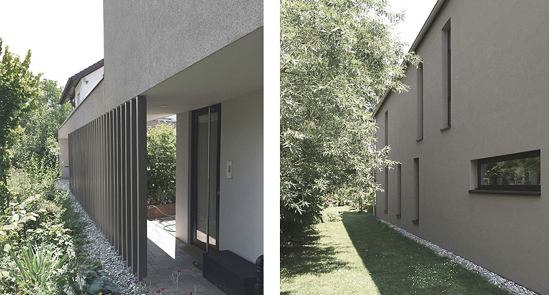 Zusammen mit einem im Südosten des Grundstücks liegenden Carport gleicher Grundrissproportion bildet das Gebäude einen privaten Innenhof, der sich nach Südwesten hin öffnet. Ein Verbindungsdach mit schräg gestellten vertikalen Holzlamellen bildet einen Filter zwischen halböffentlichen und privaten Außenräumen.
