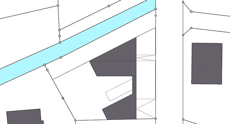 Um das verbleibende Grundstück optimal nutzen zu können, wurde der Baukörper als plastisch geformtes Viereck mit 4 unterschiedlichen Seitenlängen in die äußerste Nord-Ost-Ecke des Baufensters gerückt.