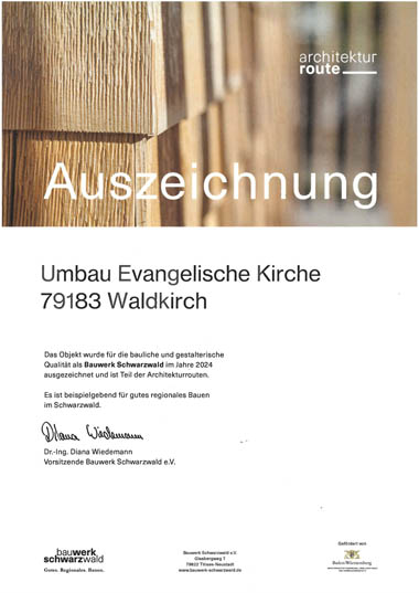 PRÄMIERUNG | „Architekturroute Schwarzwald 2024“ | Umbauprojekt ‚Evangelische Kirche Waldkirch‘ Heike Aurand2025-07-08T17:12:10+02:00