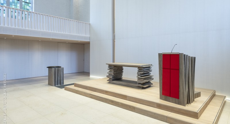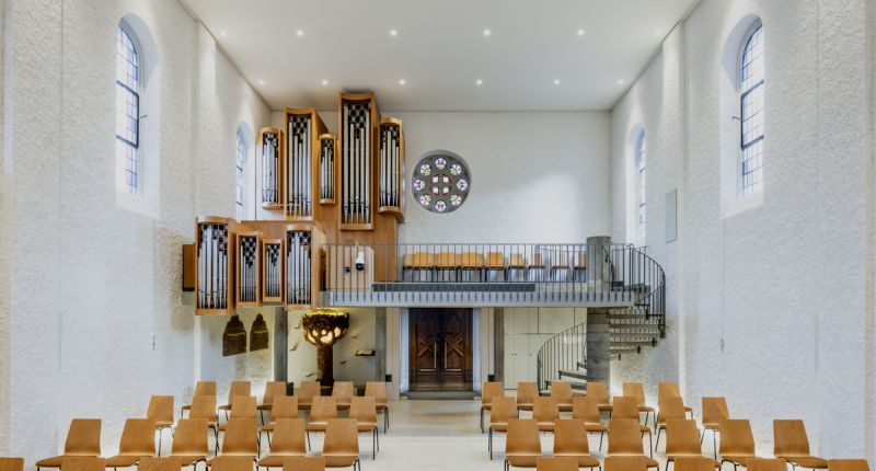 Durch wenige, aber markante Baumaßnahmen entstanden neue Übergänge vom Kirchenraum zum Gemeindebereich. Insbesondere die Rückwandgestaltung hinter dem Altarbereich und die beiden neuen seitlichen Galerien prägen die klar gestaltete Architektur des Kirchenraumes.