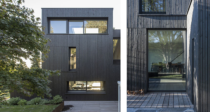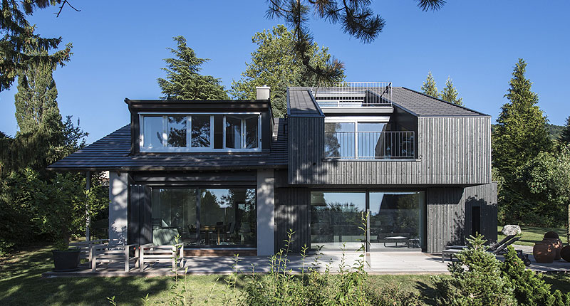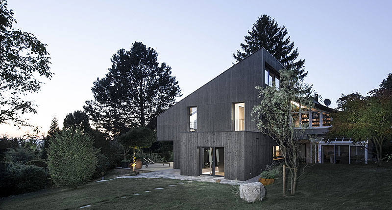 Die Aufstockung wurde als Massivholzbau realisiert und erhielt eine Verkleidung aus anthrazitfarben beschichteten vertikalen Holzlamellen.